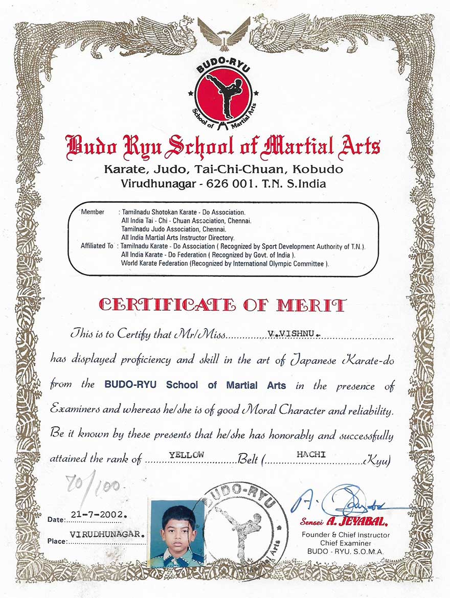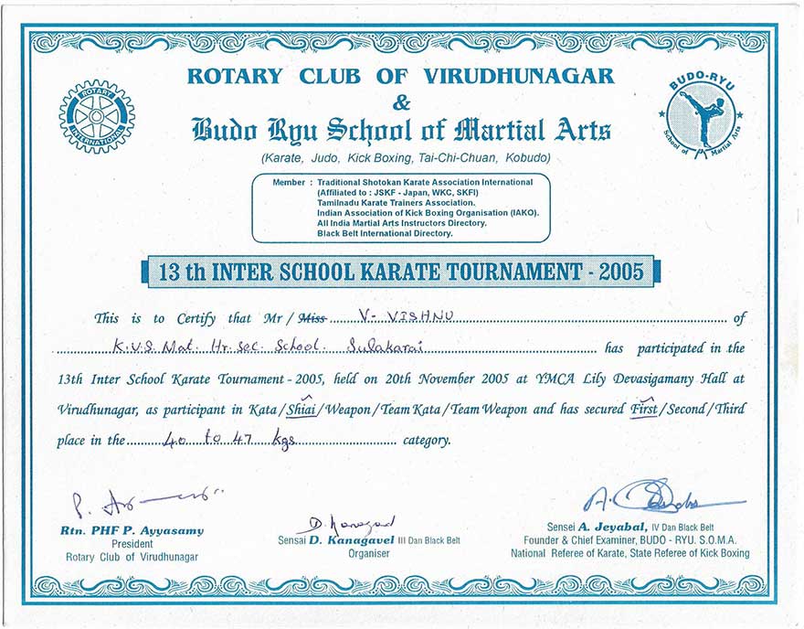 My father encouraged me to practice martial arts, drawing from his own experience when he was young. His enthusiasm deeply influenced me, and I committed to daily early morning training sessions. I was fortunate to have the guidance of dedicated instructors, Sensei Jeyabal, Sensei Selvam, and Sensei Kanagavel, who played crucial roles in maintaining my physical fitness and developing my skills. Under their tutelage, I learned various aspects of martial arts, including kata, weapons like nunchaku, tonfa, and katana, and judo techniques. Karate, an individual outdoor sport, taught me valuable life lessons such as self-control, patience, and the importance of facing problems head-on. This journey, inspired by my father and guided by my senseis, has been instrumental in shaping my character and outlook on life.